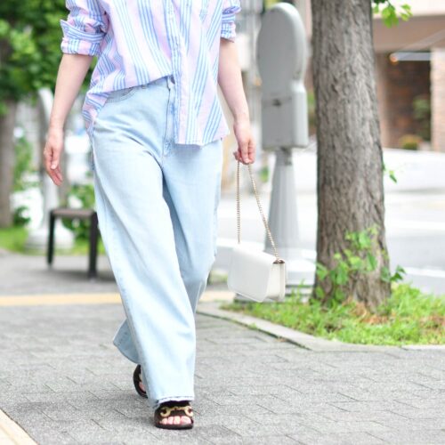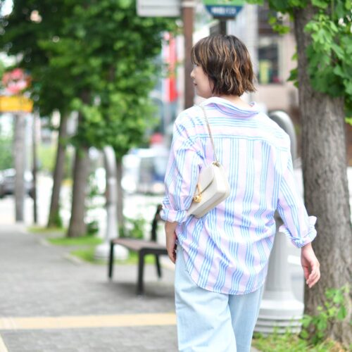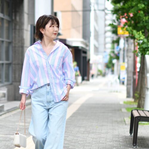 ストライプ柄の一色を拾って、ボトムはブリーチデニムをセレクト。
