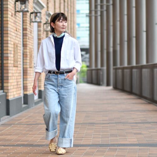 白シャツ×デニムをいまふうに。