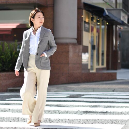 本日は、コンパクトフィットなジャケットにワイドパンツを合わせ