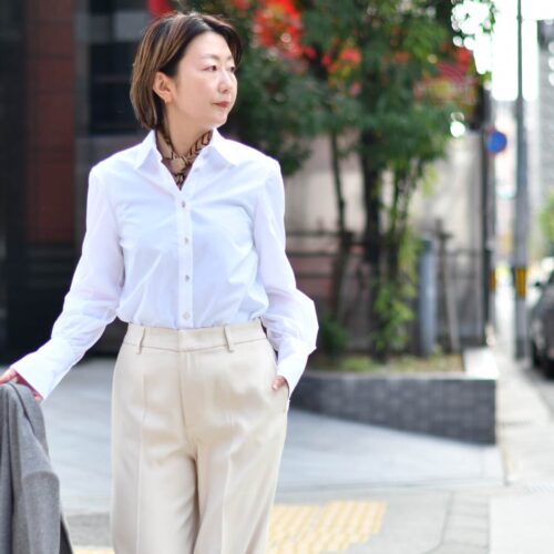 パリっとシャツと、とろみパンツのコントラストも面白いかと。