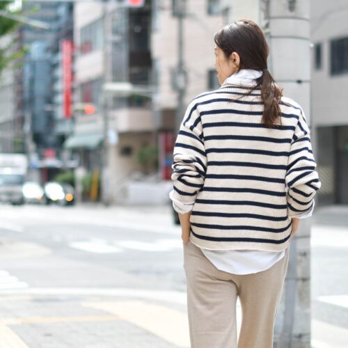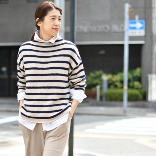 そこに、柔らかいトーンでニットパンツを合わせ、
