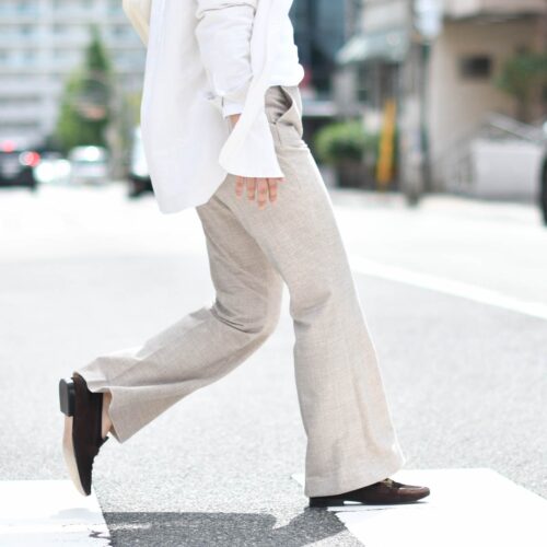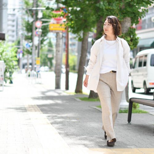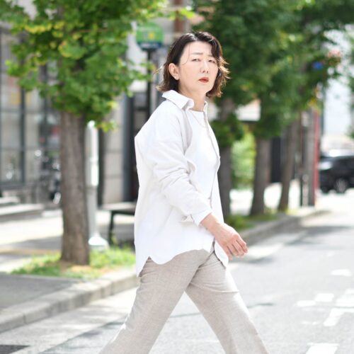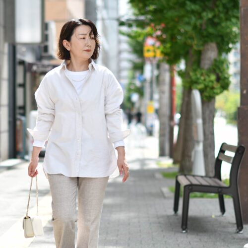 優しい色味のエクリュカラーは、白シャツ代わりにお使いいただくと