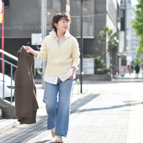 ハーフジップニット×シャツ×デニムのスポーティーなカジュアルスタイルも