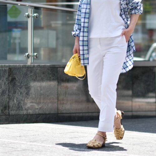 カジュアルなチェックシャツも、パキッとしたホワイトパンツとのコーディネートで