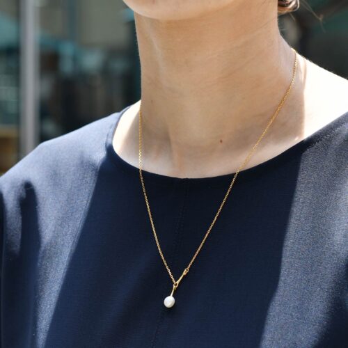 さり気なく、パールのネックレスでアクセントを加えて、