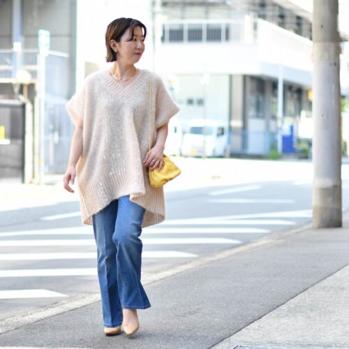 すっきりフレアデニムとのコーディネートで