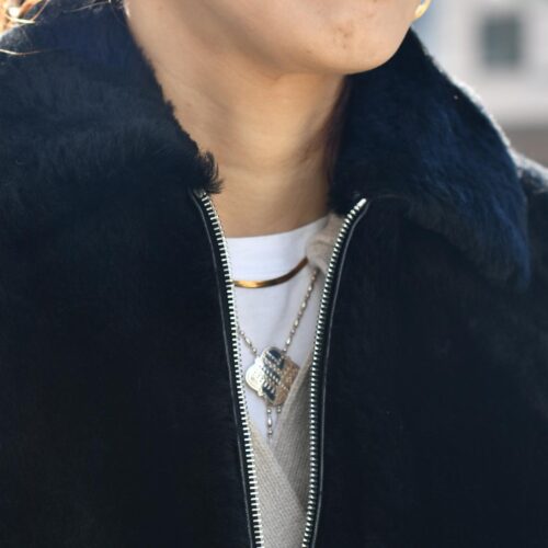 大きめの襟デザインが、ファーのボリューム感と絶妙なバランスを生み、