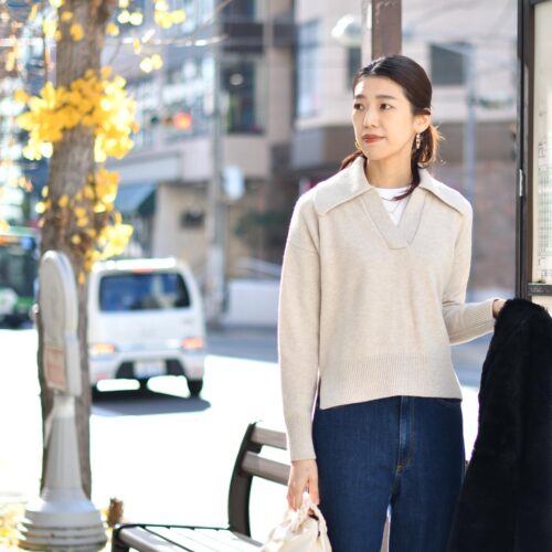 インナーには、顔周りを明るく見せるベージュのスキッパーニットをセレクト。