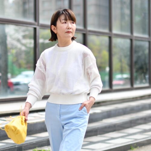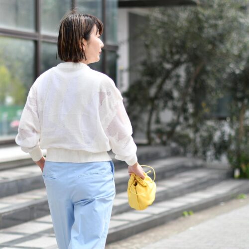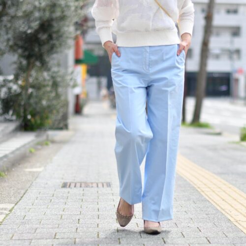 本日は、爽やかなブルーのパンツにイエローのミニバッグをポイントにコーディネートいたしました。