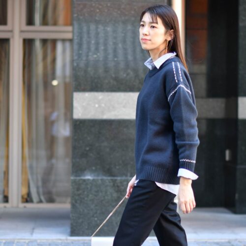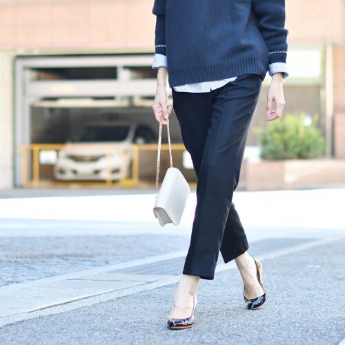 ブラックのパンツでモノトーンにスタイリング致しました。