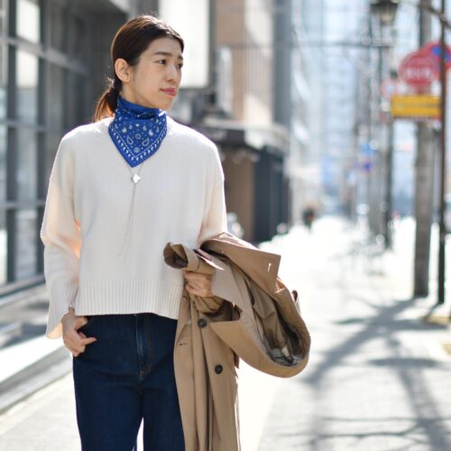 仕上げにシルクスカーフを巻くことで、防寒性を高めつつ、装いにエレガントなアクセントを添えています。