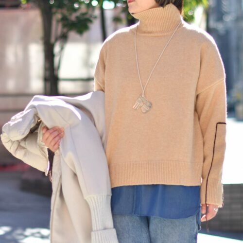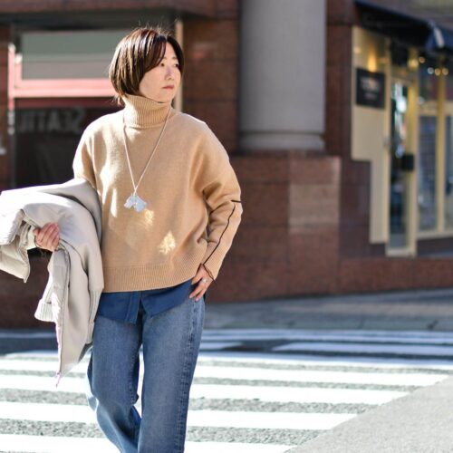 roberto collinaのハイネックニットにデニムシャツをレイヤード。