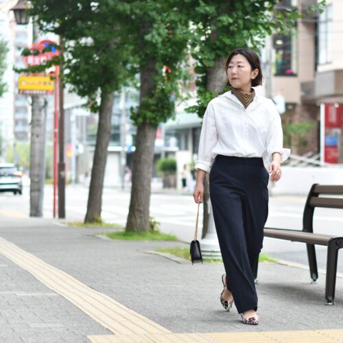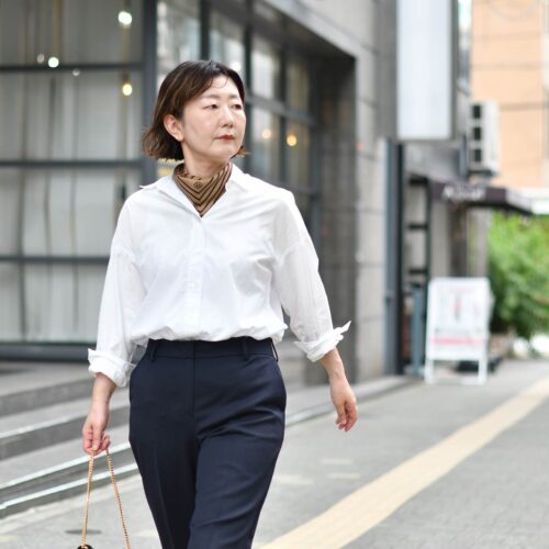 白シャツ×ネイビーパンツのクラシカルなスタイルも