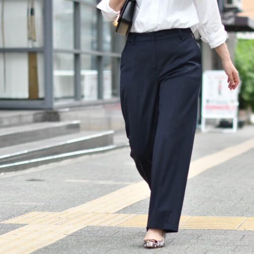 オンオフ問わずお召しいただきやすいネイビーのワイドパンツ。