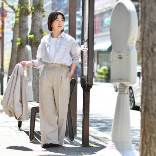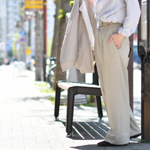 トップスはタックインし、ウエストラインを見せてお召しいただくのがオススメです。