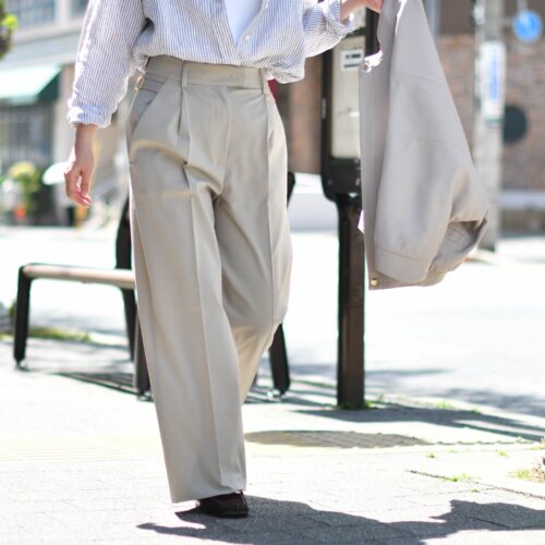股上が深く、腰まわりにゆとりのあるタック入りのワイドパンツ。